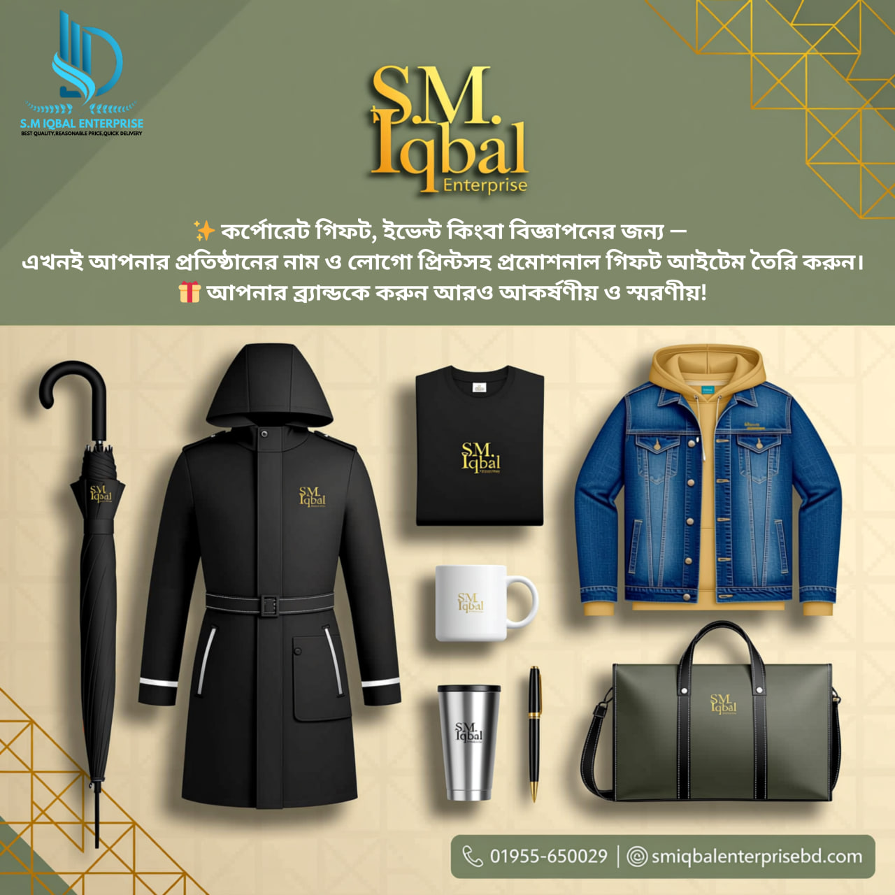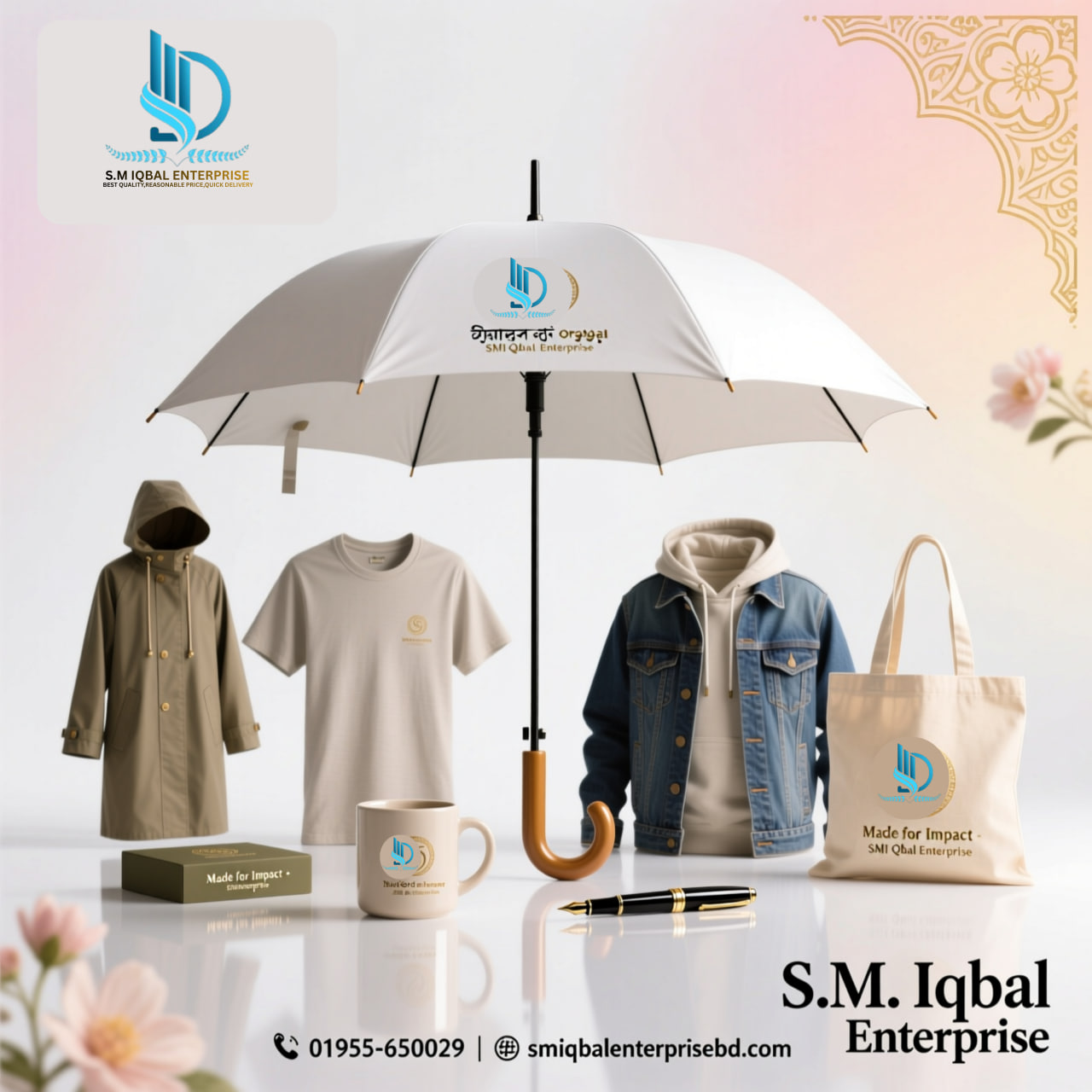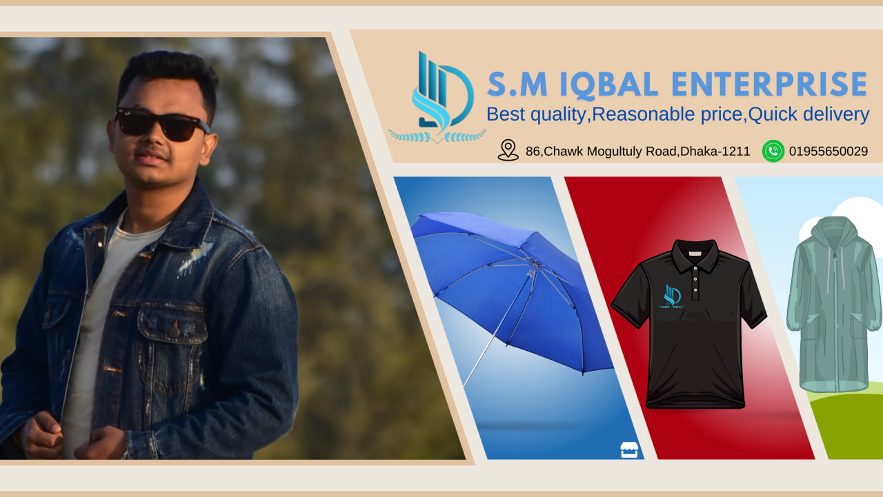 Welcome to S.M. Iqbal Enterprise, your trusted partner in delivering high-quality products proudly made in Bangladesh. All kind of gifts item with logo, umbrella, t-shirt, ceramics item, onetime cup, offcial bag, leather bag, pen, cap etc. We are a well-established company with a reputation for excellence, offering a wide range of everyday essentials, from umbrellas to office bags, all designed to enhance your lifestyle.